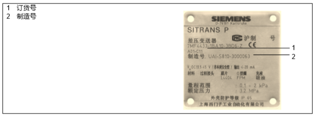 按照用户合同上的技术要求,西门子压力变送器的组件有不同的配置。 带有合同编号的铭牌可在表体的侧面找到。你可以根据具体的代码和技术规格说明,确定选项的构成细节和允许的测量范围(即封装的传感器元件的物理特性)。