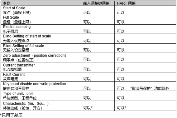 西门子压力变送器参数的调整可以在现场通过仪表自身配备的三个输入调整键实现,也可以通过HART 协议外部实现。以下表中列出的为上述可实现的基本参数。其它用于特别用途的参数可以通过 HART 协议调整。